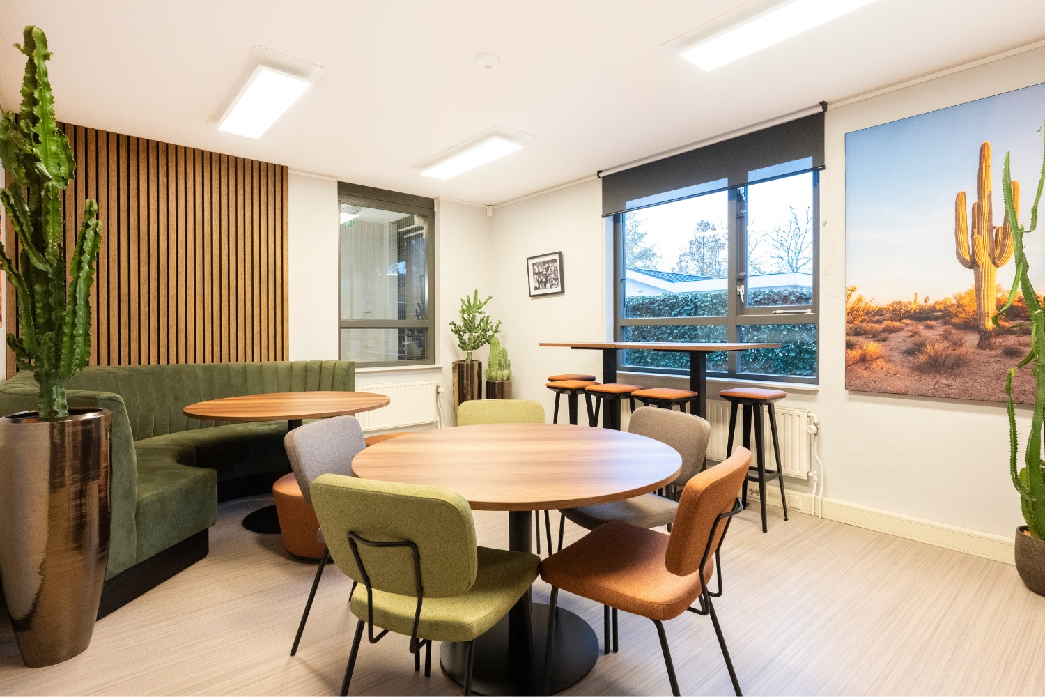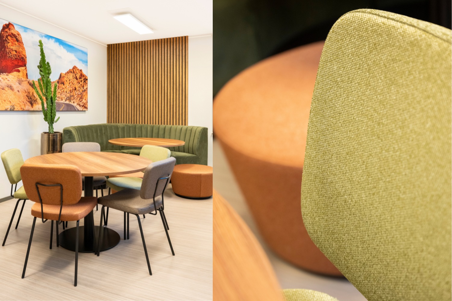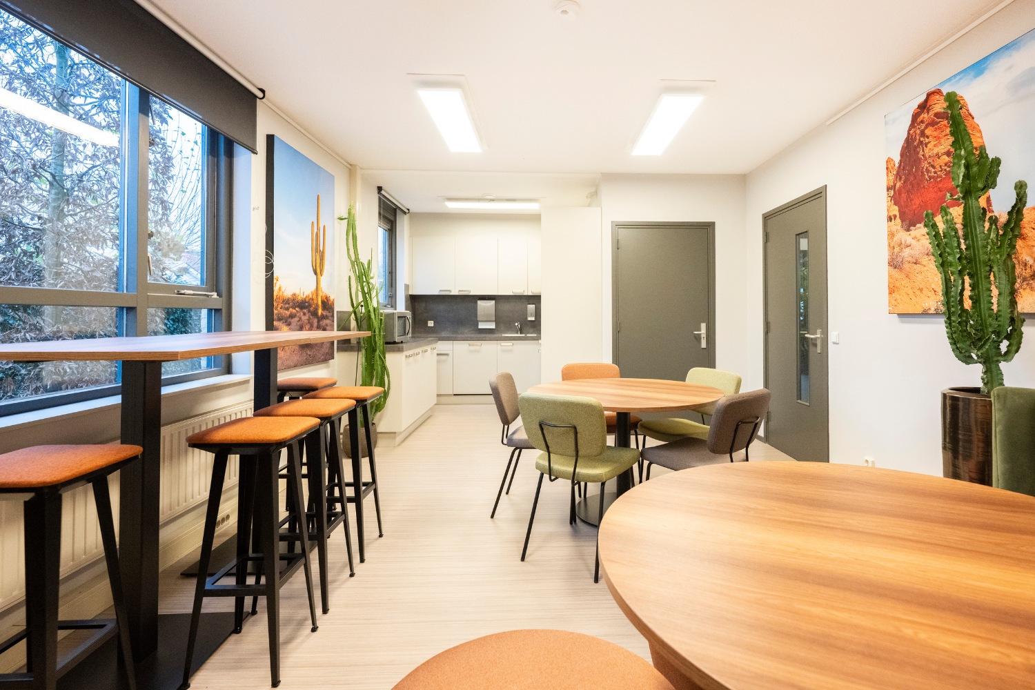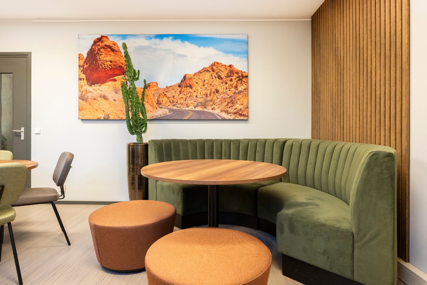 Voor Witlox Ulvenhout is de kantine getransformeerd tot een warme, uitnodigende ruimte met een subtiele desert vibe. Aardetinten, natuurlijke materialen en zachte vormen zorgen voor een rustige maar frisse sfeer waar je graag even blijft zitten.