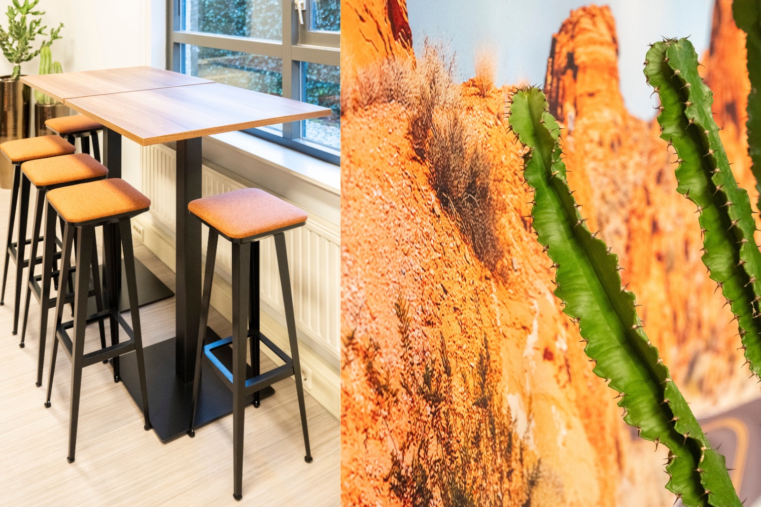 Bij binnenkomst valt direct de beplanting op: levendig groen dat krachtig afsteekt tegen de warme aardetinten en de ruimte meteen tot leven brengt. De echte cactussen versterken de desert sfeer en brengen het geheel samen tot één kloppend concept.
